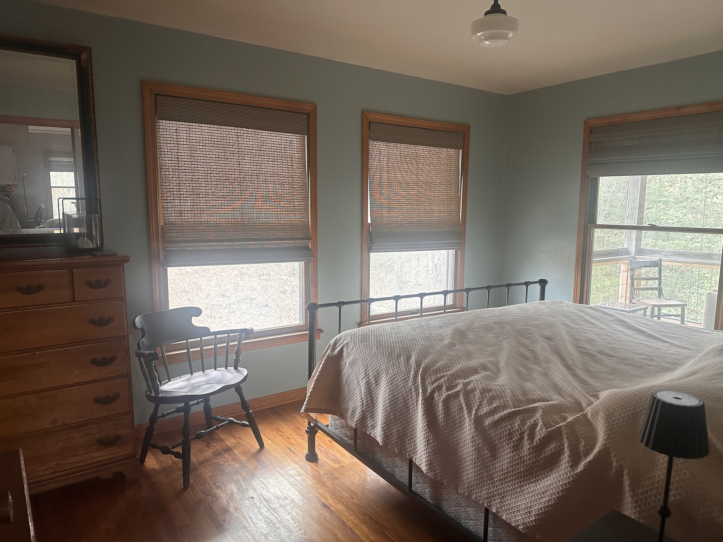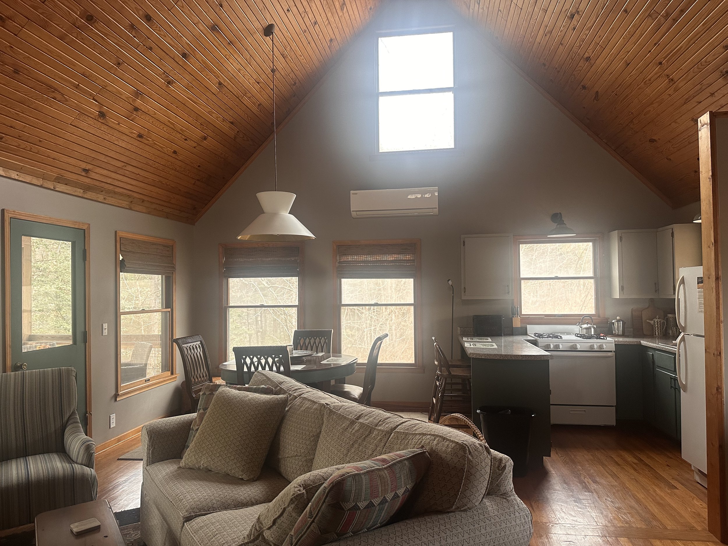 Salem House is nestled in a secluded valley to the north of Cold Springs Lake. It can accommodate up to 4-6 people. It features a full kitchen and a dining area with a large screened porch overlooking a stream. Salem has one bedroom with a king bed and a full private bathroom. There is a loft with two twin beds. The living room has a full sleep sofa as well. The cabin also has a common 1/2 bath. It is heated with a propane heater as well as a wood stove and supplied with ample firewood in season. It has Air Conditioning for Summer months. Salem has a small library. The screened porch has a day bed as well as rockers and a dining table.