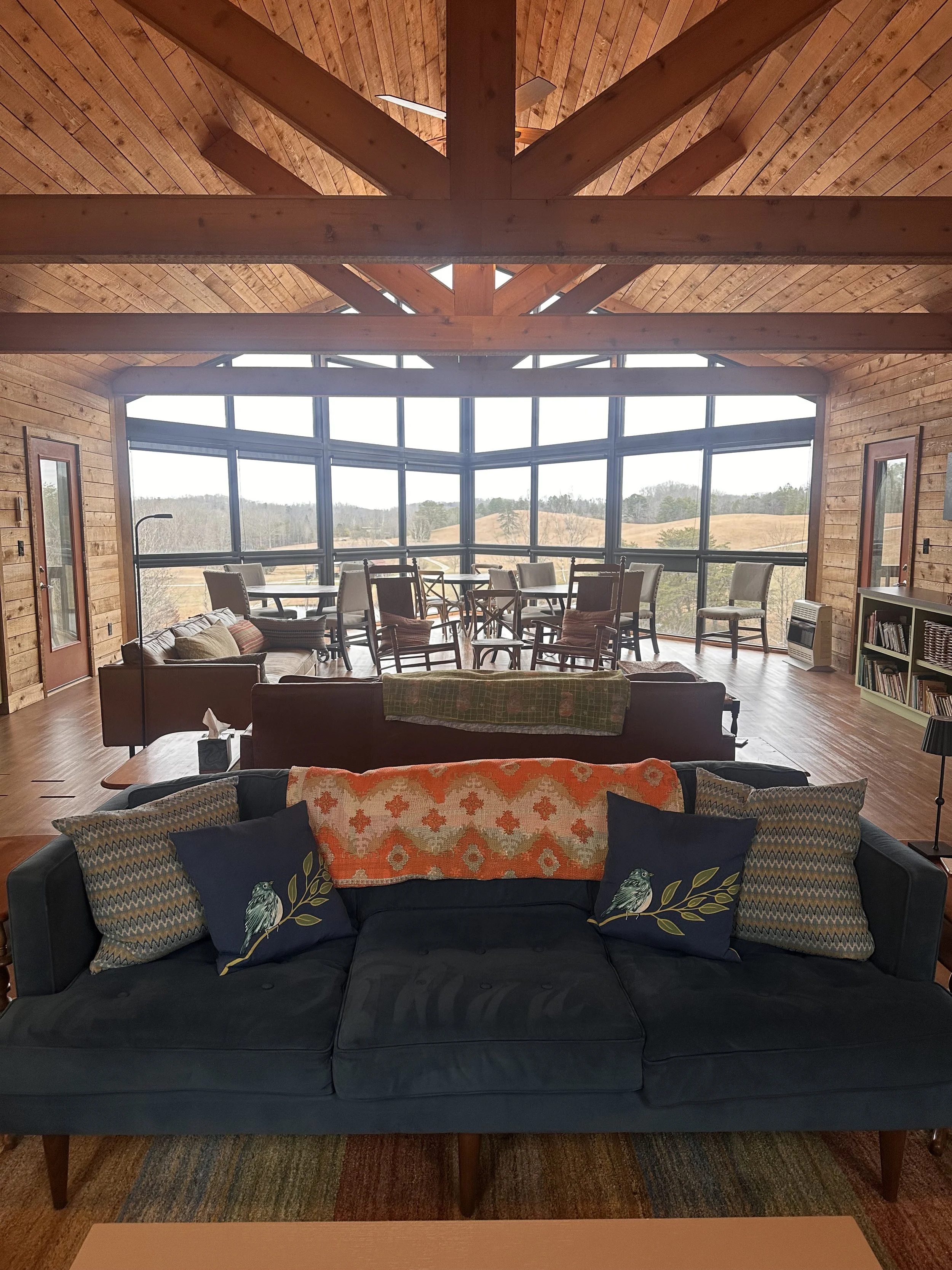 The Chapel of the Broken Vessel sits prominently nearby on the hilltop with a panoramic view of the gorge, distant hills, cabins, lodges, and the lake located in the center of the property. The chapel is a wood and glass structure which allows light throughout. Seating will accommodate approximately 30 people. The east glassed end of the chapel opens to view the Rockcastle River Gorge and the Cane Creek valley and a formal Carol Barr Memorial Garden. Retreatants can sit in study and contemplation among the beautiful Autumn colors and the muffled roar of the Rockcastle Narrows rapids.